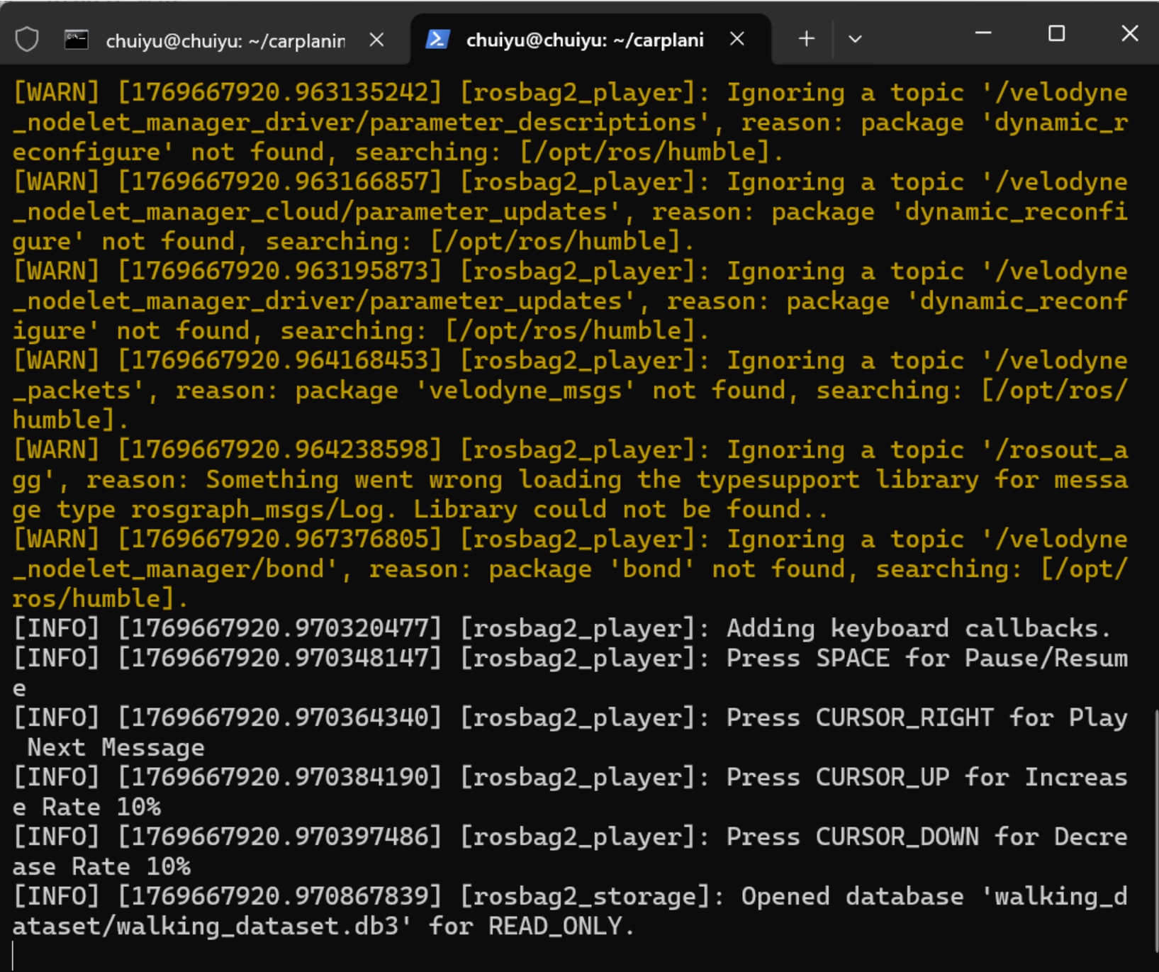 (1)下载数据集 github的README中有下载链接,下载walking dataset数据集 (2)转换格式 下载的数据集是ROS1的.bag格式,需要进行转换,执行如下命令 rosbags-convert --src [ROS1格式数据集文件] --dst [ROS2格式数据集路径]