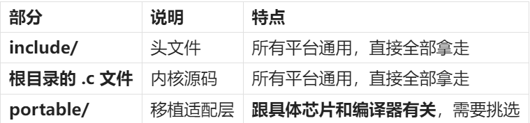 • port → 对应 portable/,放跟我们芯片和编译器相关的适配代码