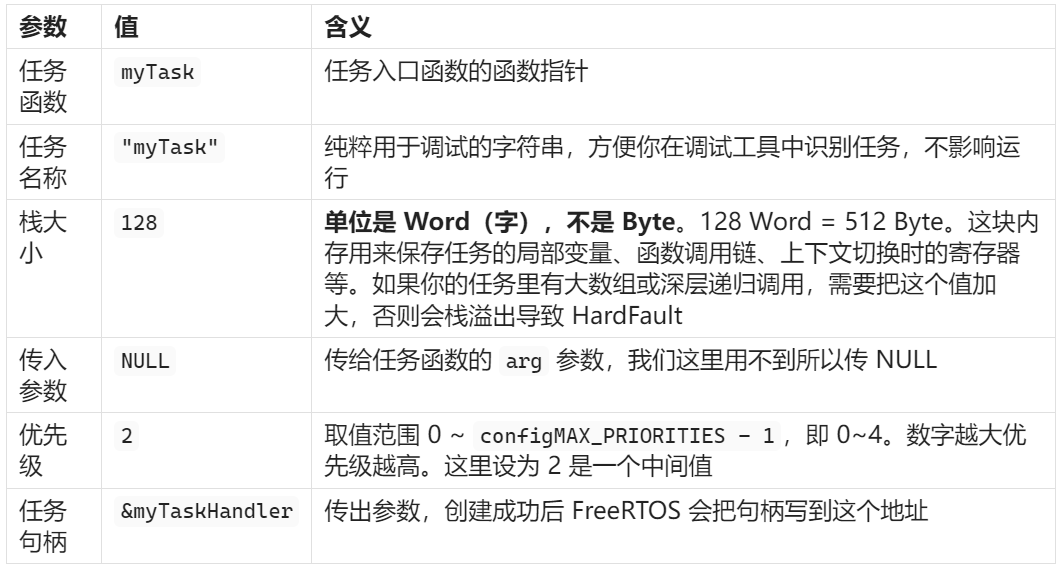 任务句柄,可以理解为这个任务的"身份证号"。创建任务后,FreeRTOS 会把任务的控制信息填到这个句柄里。以后如果你想删除、挂起或查询这个任务的状态,就需要通过这个句柄来操作。如果你创建完任务之后不需要再操控它,这个参数也可以传 NULL