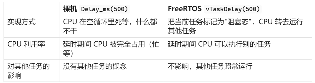 这里重点说一下 vTaskDelay(500) 和裸机中的 Delay_ms(500) 的区别,这是理解 RTOS 最关键的地方之一: